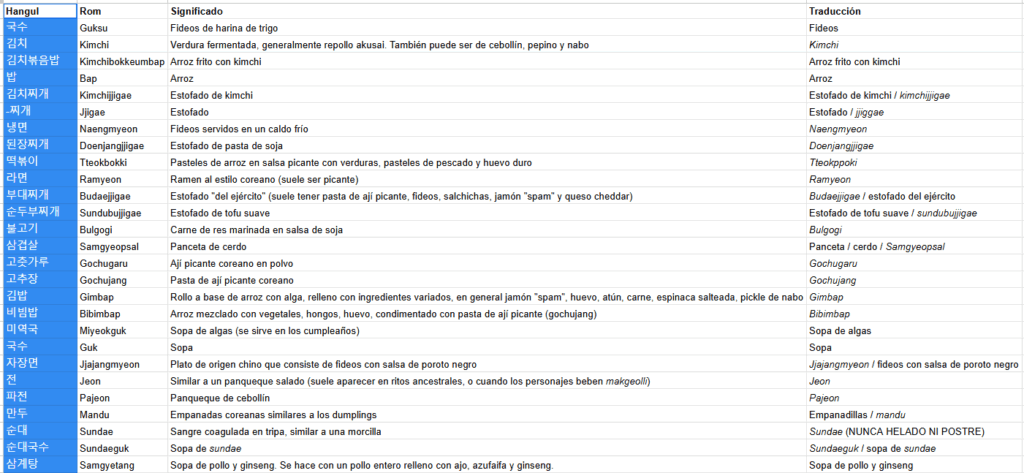 Los aspectos culturales también afectan los tratos y la forma en que la cultura meta los percibe. En occidente, no utilizamos honoríficos o palabras familiares para referirnos a nuestro entorno en general. Y por eso es necesario tener conocimiento sobre ambas culturas, para no malinterpretar dichas palabras honoríficas. Dicho esto, presentamos un recurso para facilitar la vida del traductor audiovisual, particularmente de español, cuando le toca enfrentarse al reto de traducir contenido de una cultura tan rica como la coreana, aunque inmensamente diferente. Se trata de un glosario en el que podrán encontrar una gran cantidad de términos categorizados, con explicaciones y sugerencias de traducción para simplificar la tarea del día a día. Esperamos que este trabajo les resulte útil, ya que fue creado con esa finalidad.