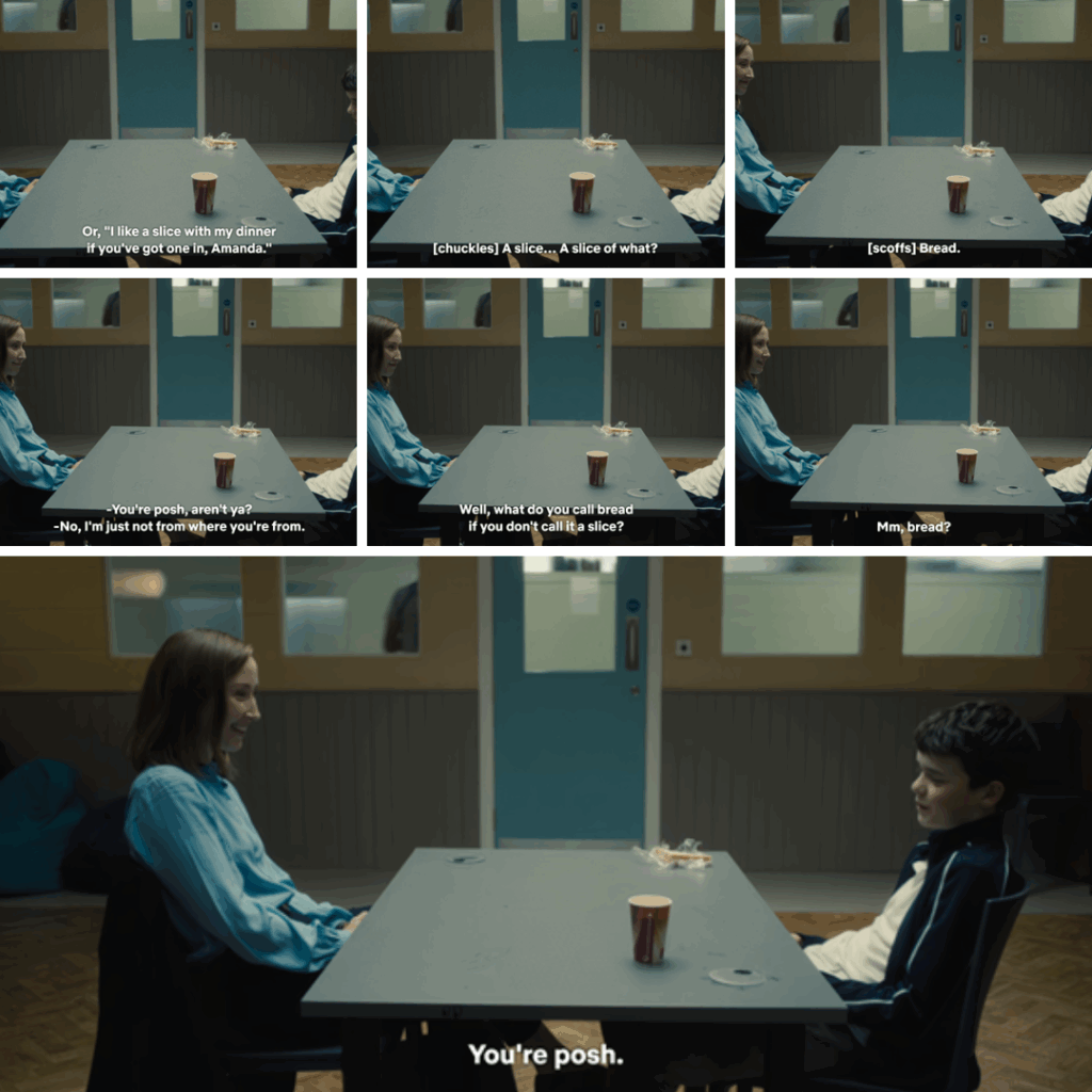 Aquí mencionaremos dos ejemplos para poder comprender mejor el concepto de idiolecto y su influencia en la construcción del personaje a través de series renombradas. En el capítulo 3 de la miniserie británica Adolescencia, de Netflix, hay un diálogo intenso entre el personaje principal, Jamie Miller, y la psicóloga designada para su caso, interpretada por la actriz Erin Doherty, previamente conocida por ponerse en la piel de la princesa Ana en la serie The Crown. En esta escena podemos percibir la diferencia en los acentos de los personajes y cómo construyen sus variaciones regionales, que entran en una suerte de tensión y de burla por parte del actor cuando ambos nombran un objeto de diferente manera. Además, el actor utiliza un término de manera peyorativa para referirse a la psicóloga (posh).